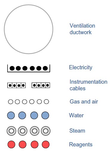 - Among wet services, reagent and acidic pipework occupy the lowest tier. This precautionary measure prevents damage from potential leaks, protecting other services from corrosive substances.